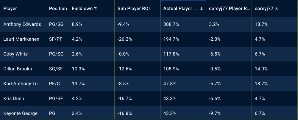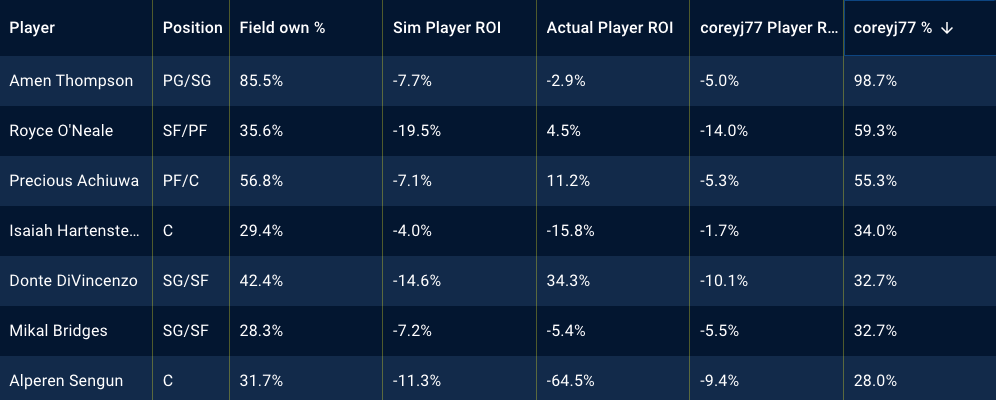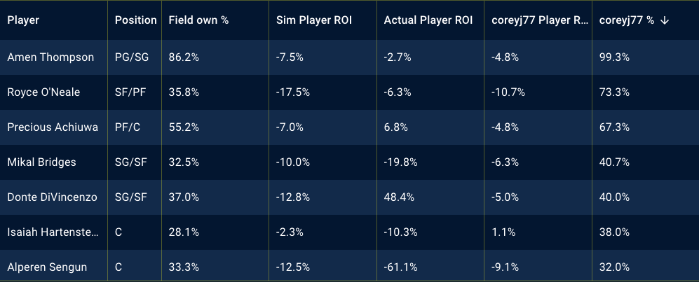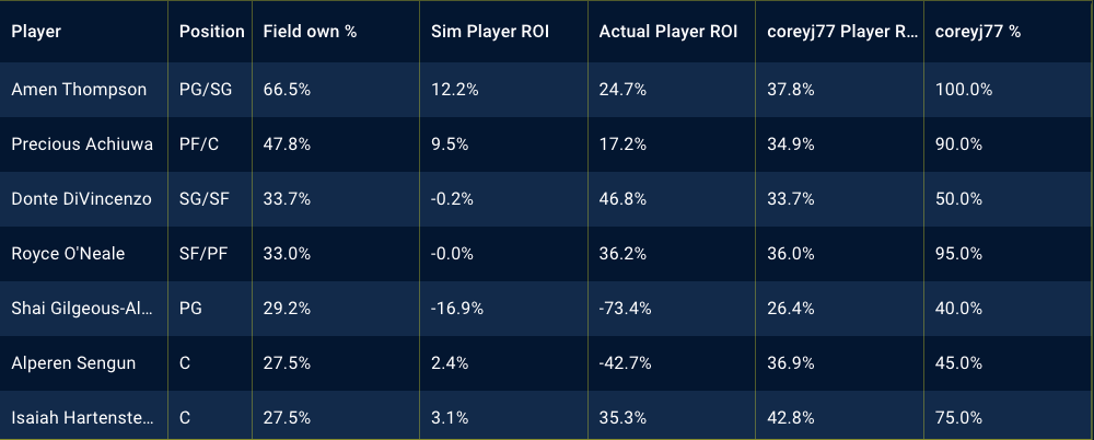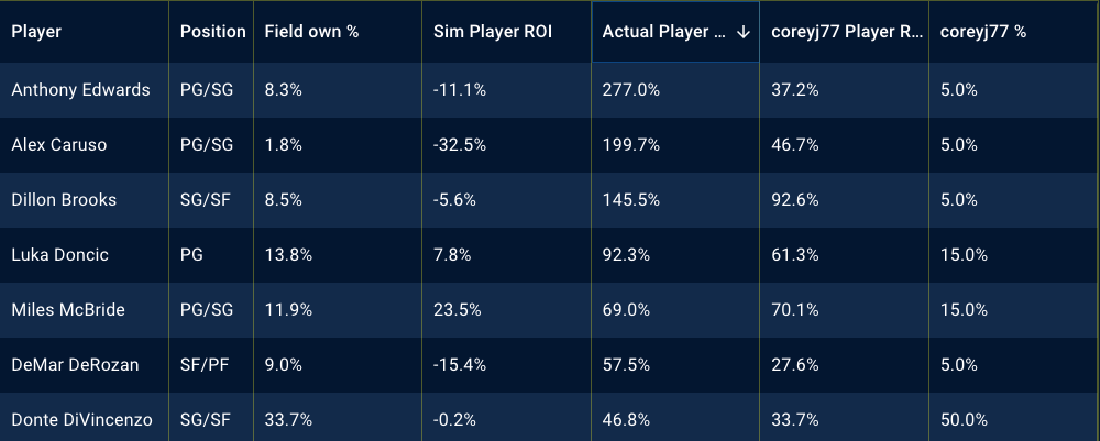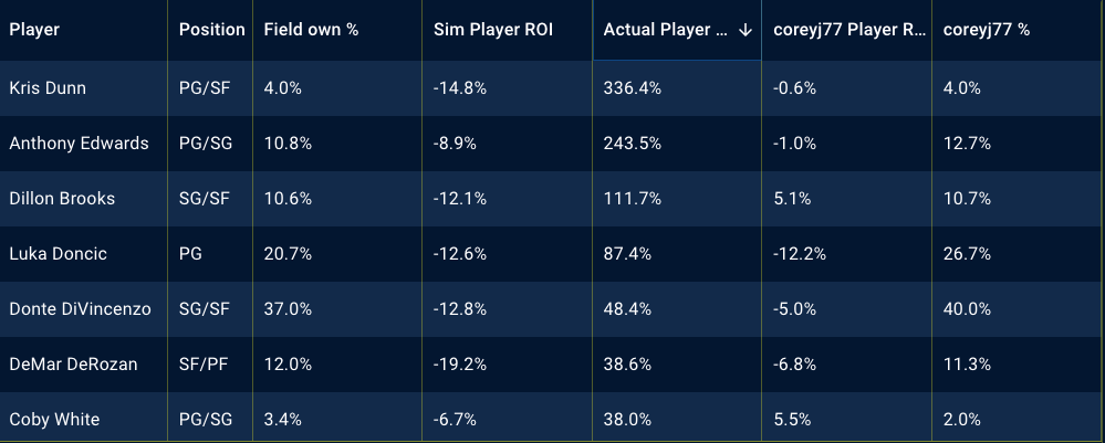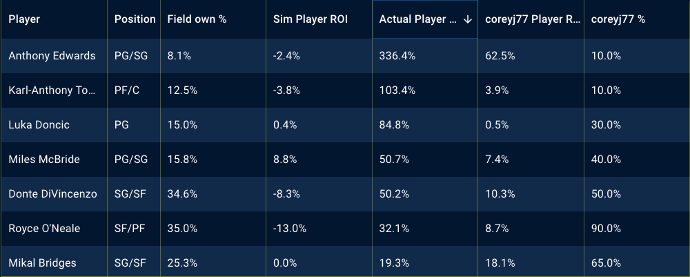 Below, there are tables showing my top player exposures in different contests and the best performing players of the night, along with my exposures to them. Utilizing the Stokastic Post-Contest Simulator, I am able to review my lineups, down to the individual players and how they performed against the field. Below, you’ll see screen shots per contest. The first is sorted by my player exposure and the second is sorted by actual player ROI.